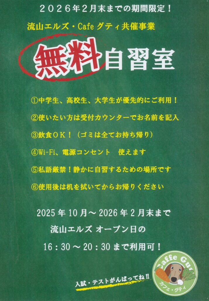 10月1日~2月28日の期間 カフェグティ内で 無料自習室をオープンします!