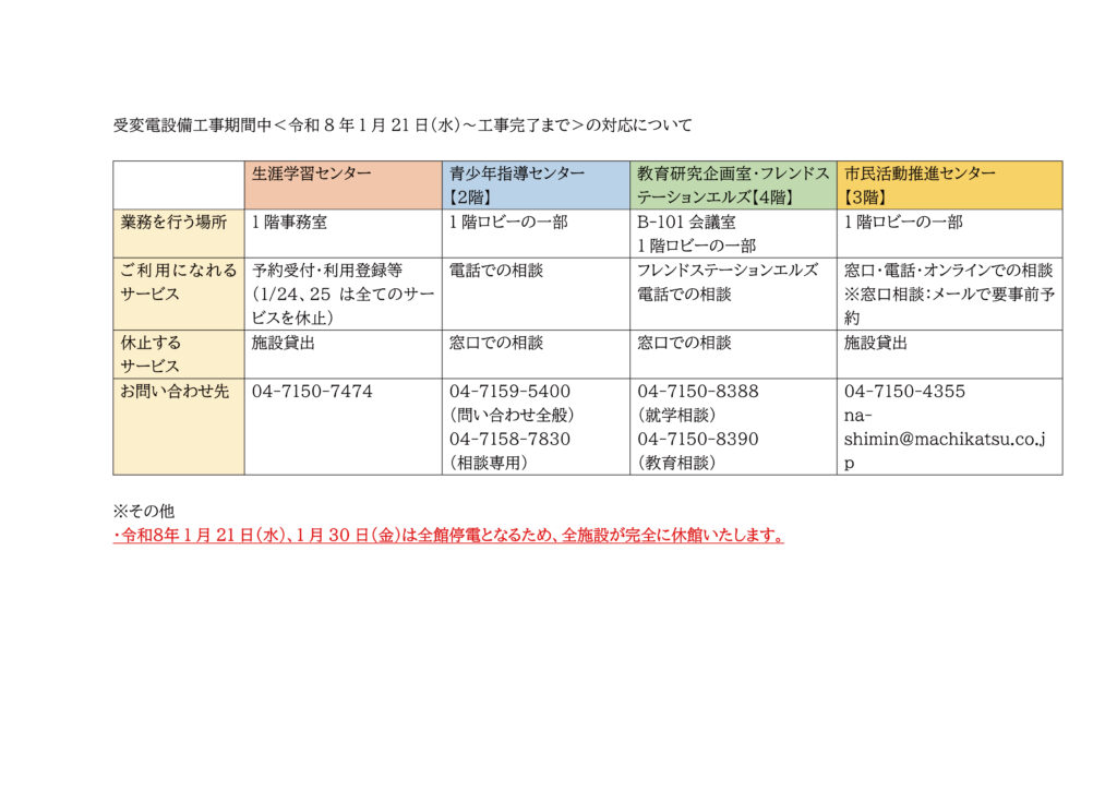 受変電設備工事の実施に伴い、下記の日程で施設貸し出しを休止します。 期間:令和8年1月21日(水曜日)~2月8日(日曜日)